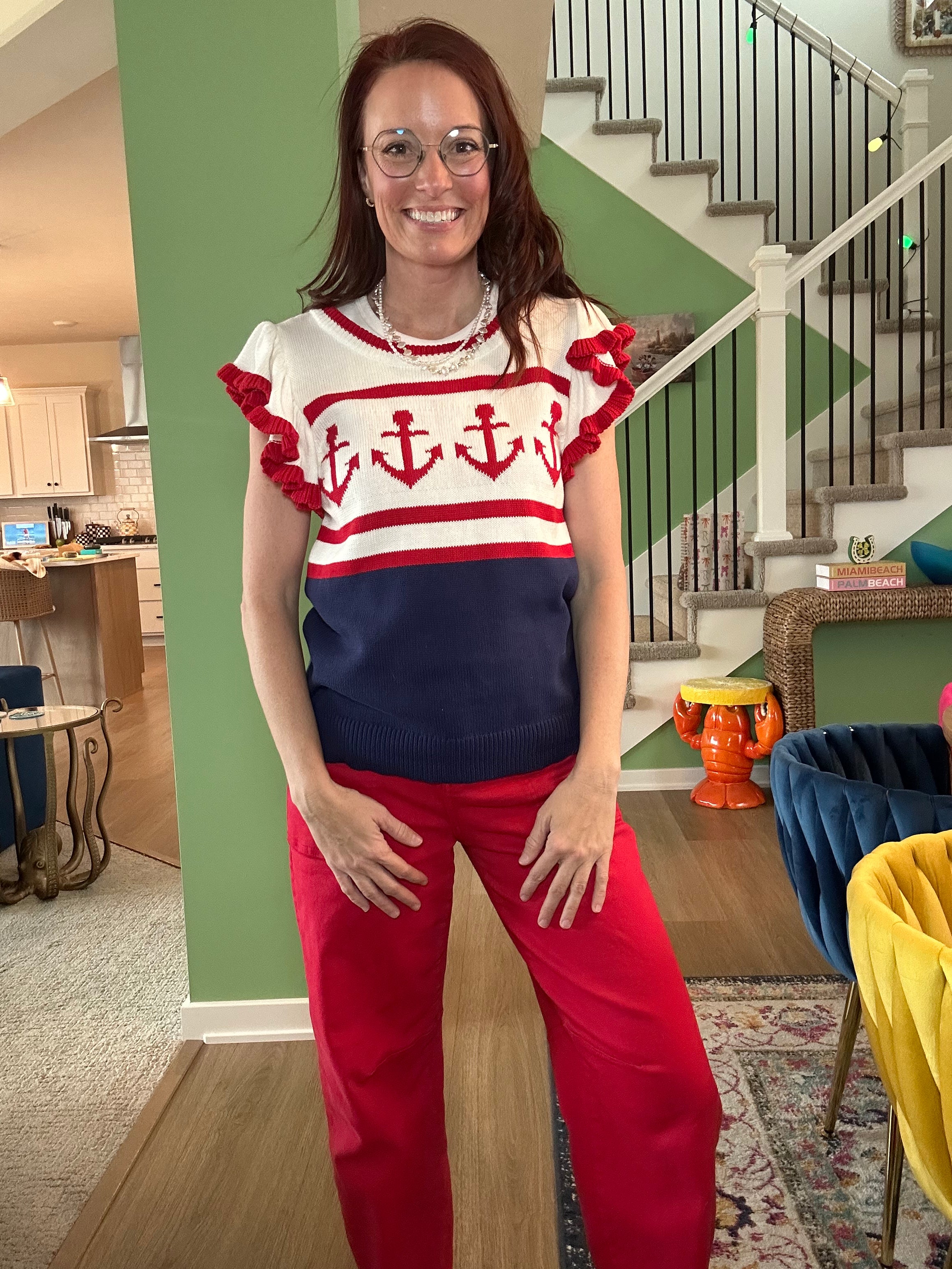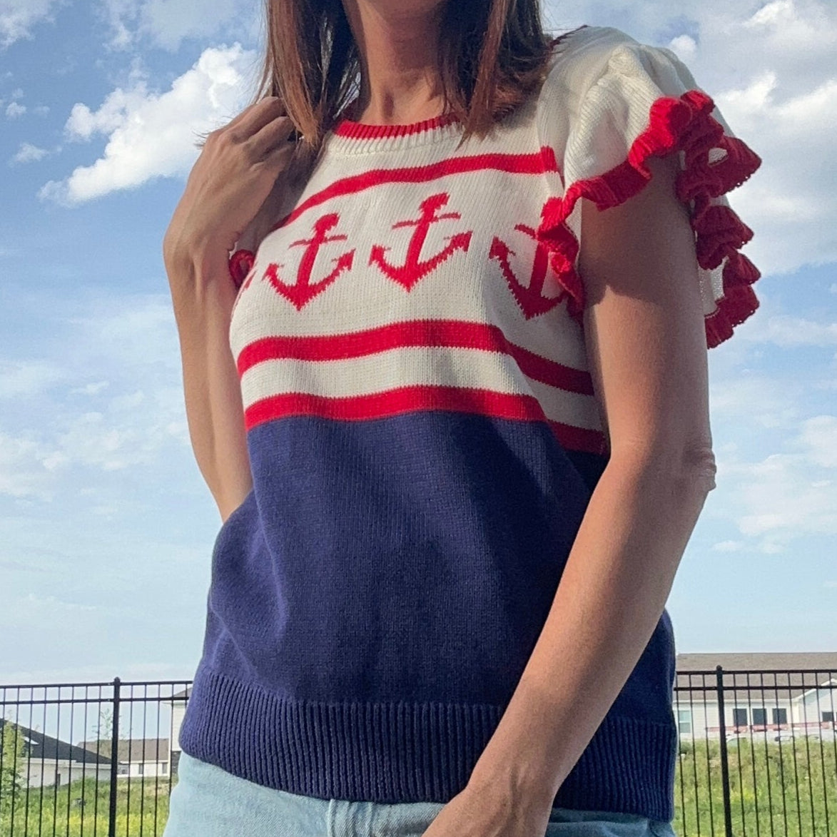 Expertly crafted with a patriotic design, the Anchors Away Top is the perfect addition to your wardrobe. Made with red, white, and blue anchors, this sweater top fits true to size for a comfortable and stylish look. Show off your love for your country while staying on trend with this must-have top.