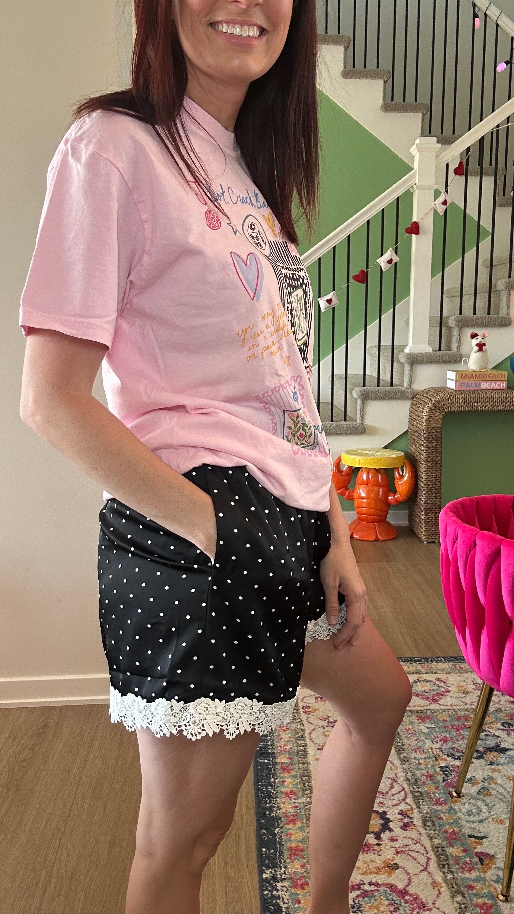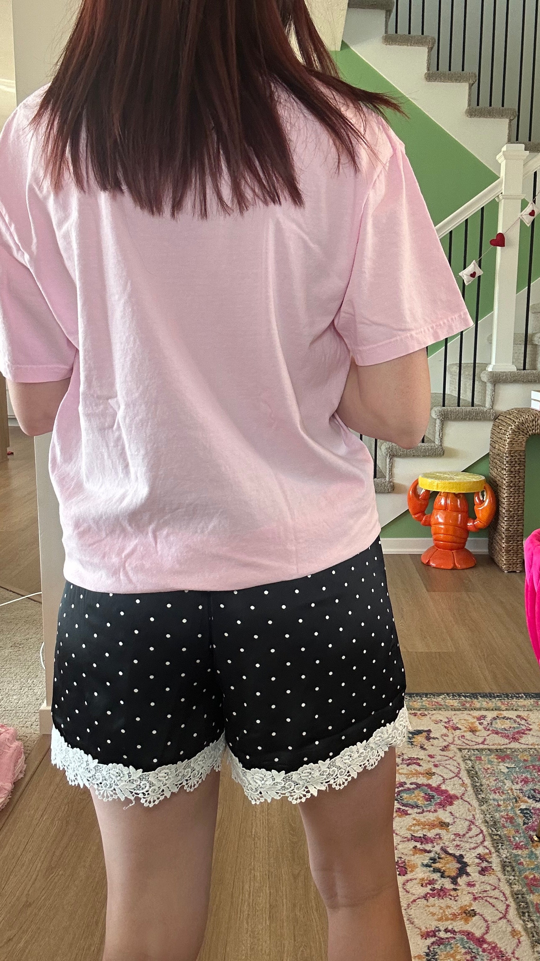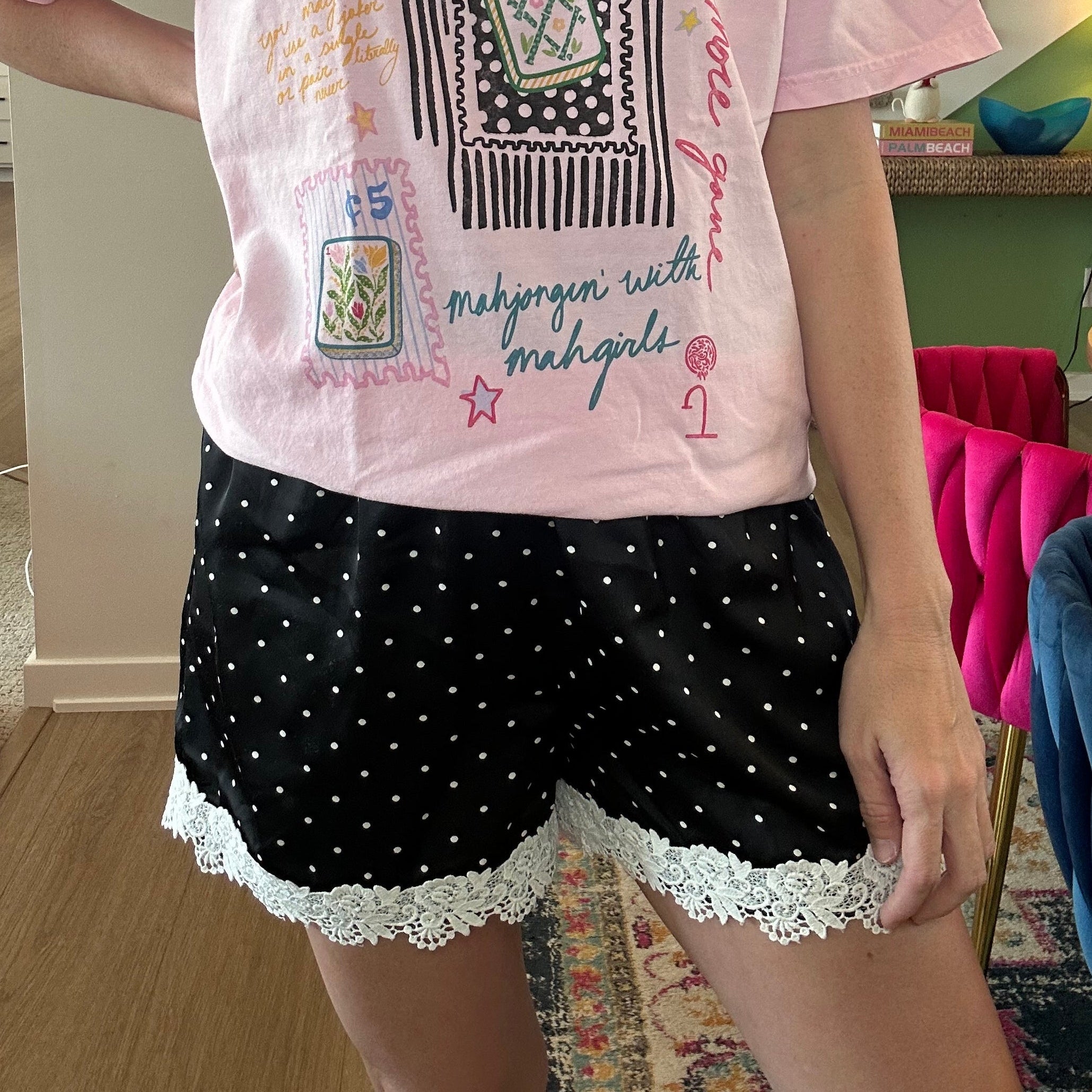 Elevate your loungewear collection with these sophisticated satin shorts, featuring a striking black base adorned with crisp white polka dots. Delicate lace detailing along the hem adds an unexpected touch of elegance, transforming a casual piece into something worthy of your most refined moments. The smooth satin fabric drapes beautifully while maintaining comfort, making these shorts perfect for relaxing at home or layering under sheer pieces. A timeless pattern meets modern sensibility in this versatile essential.