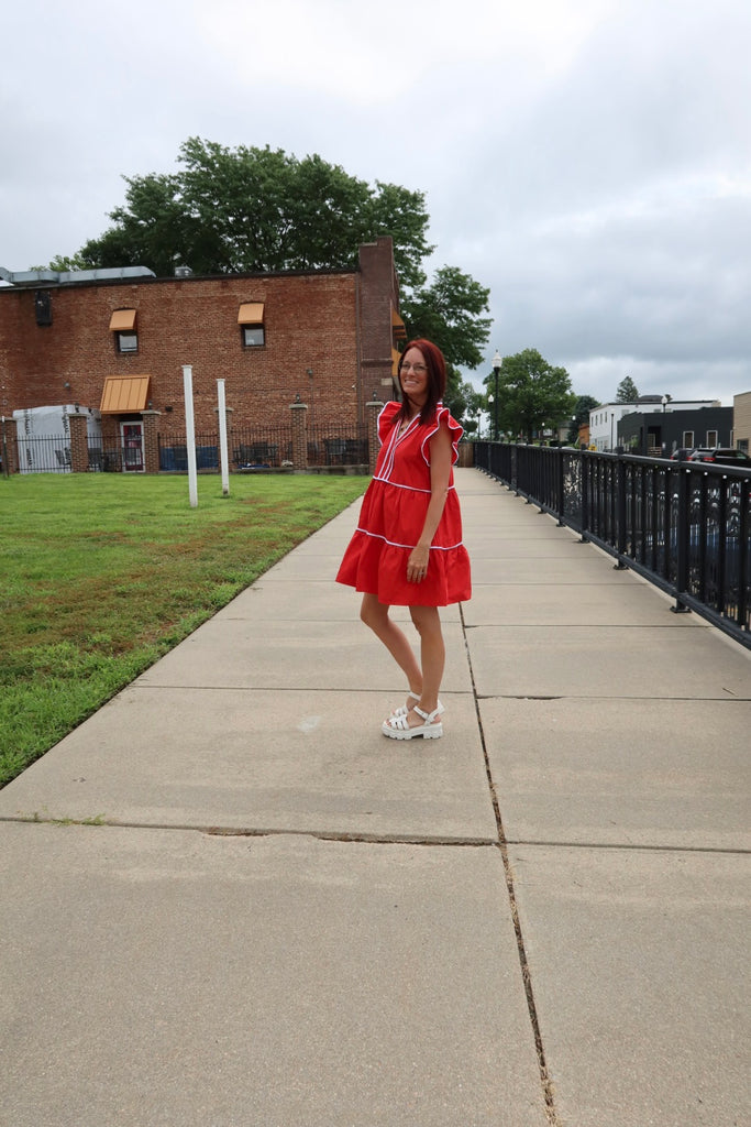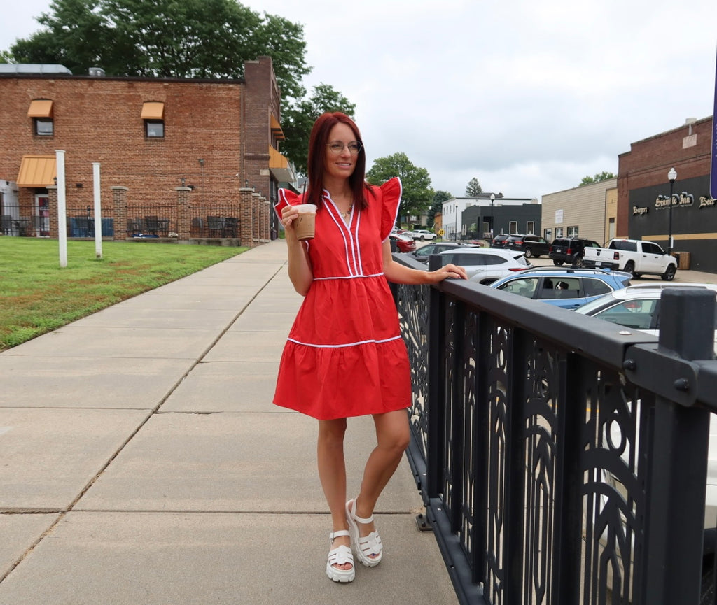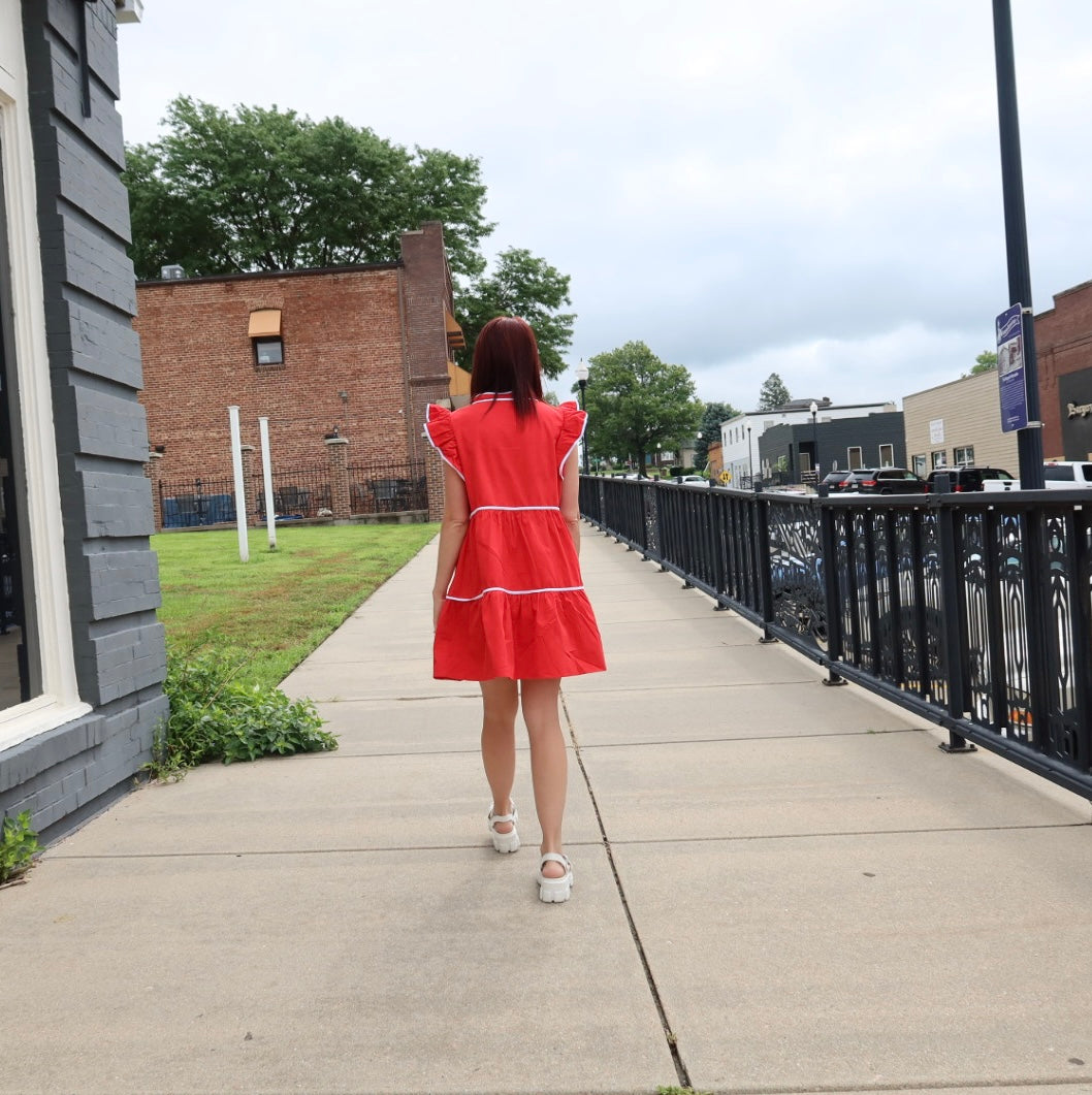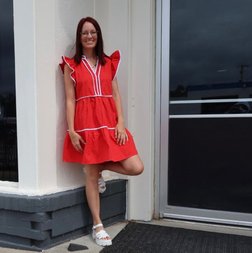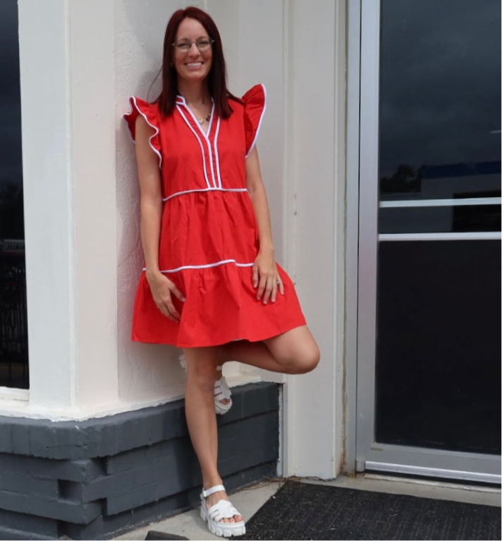 This red and white dress is designed specifically for gameday, combining style and comfort. Crafted to fit true to size, it ensures a flattering silhouette while allowing ease of movement. Ideal for showing team spirit with a polished look, this dress balances vibrant colors with a tailored fit for confident wear throughout the event.