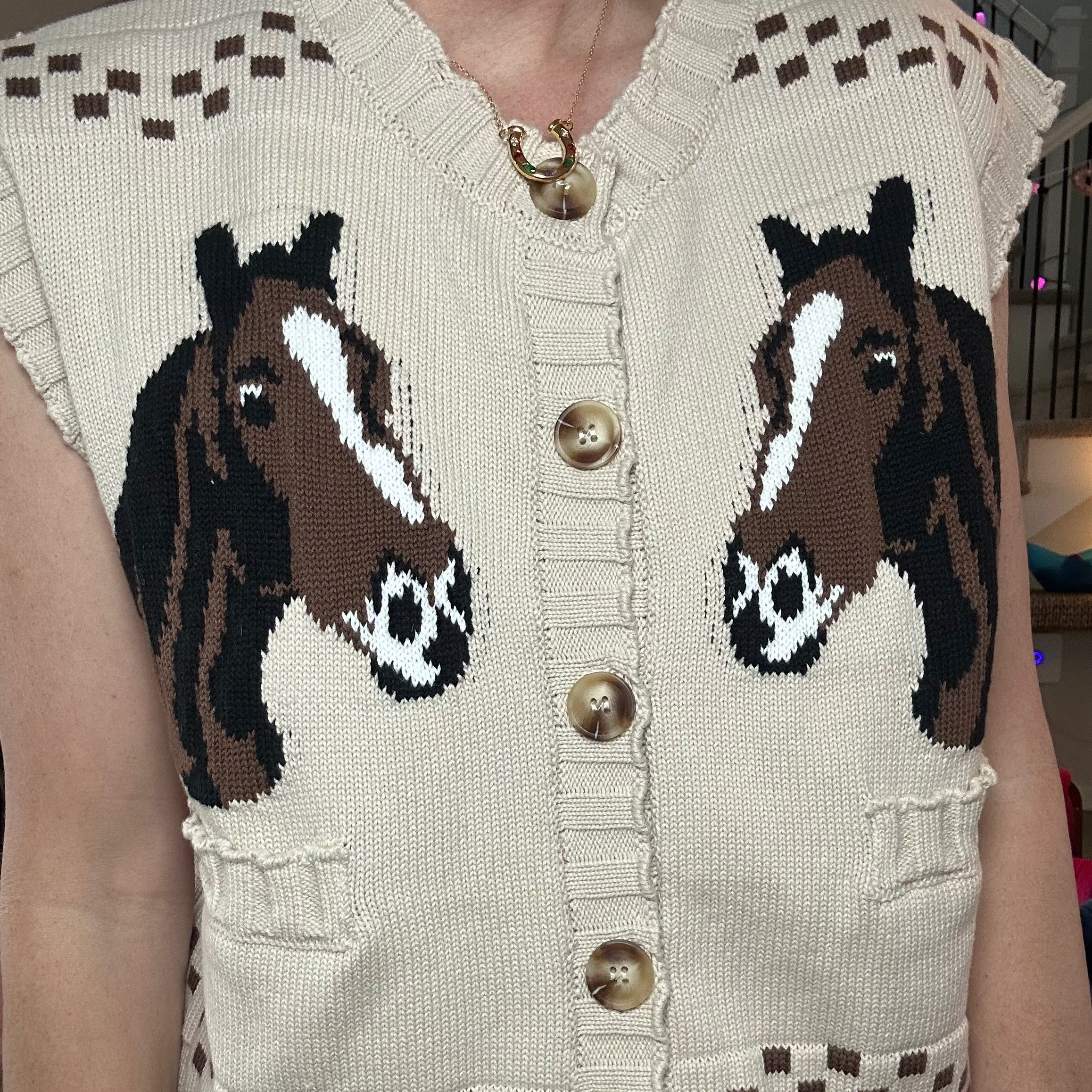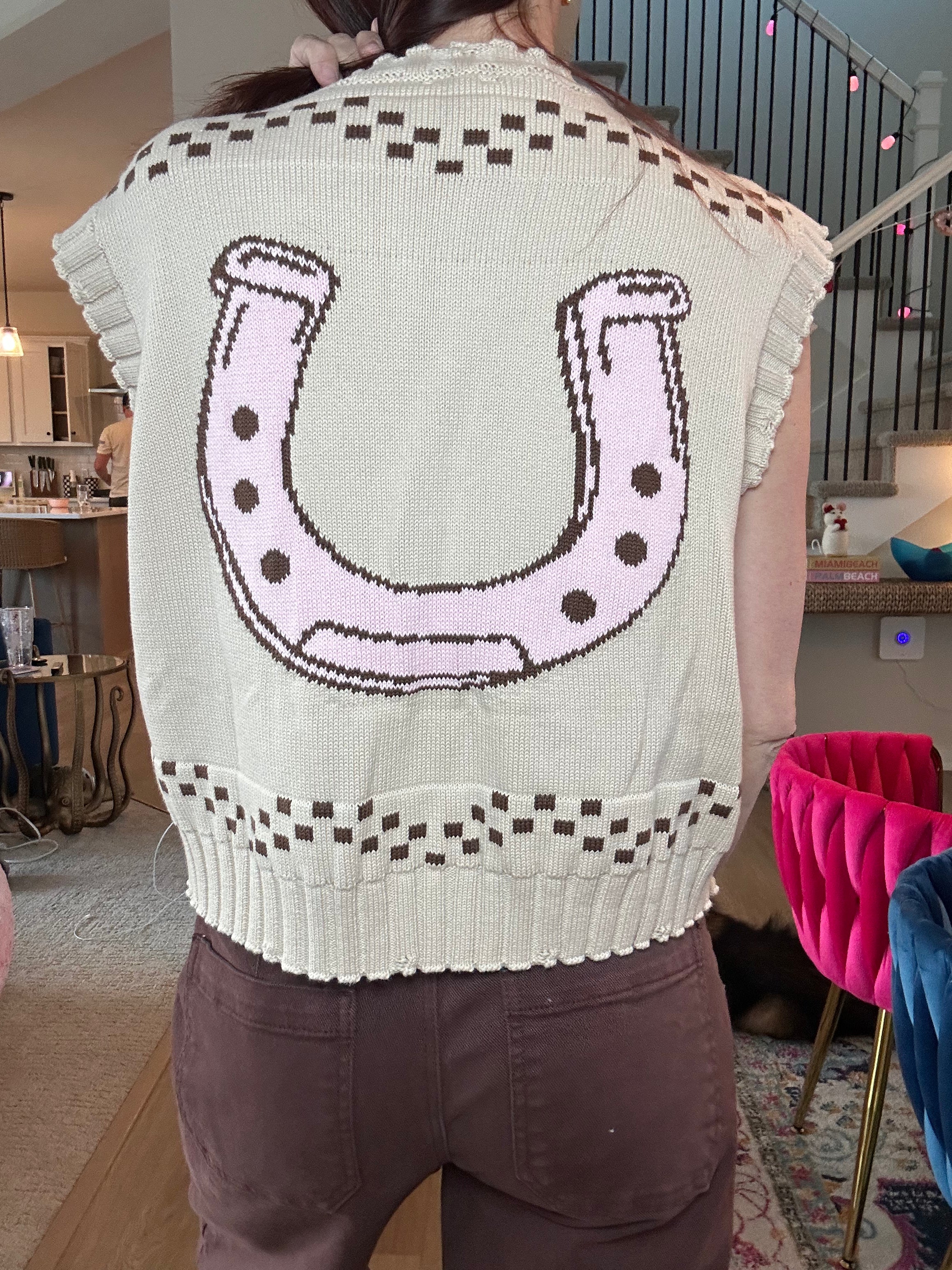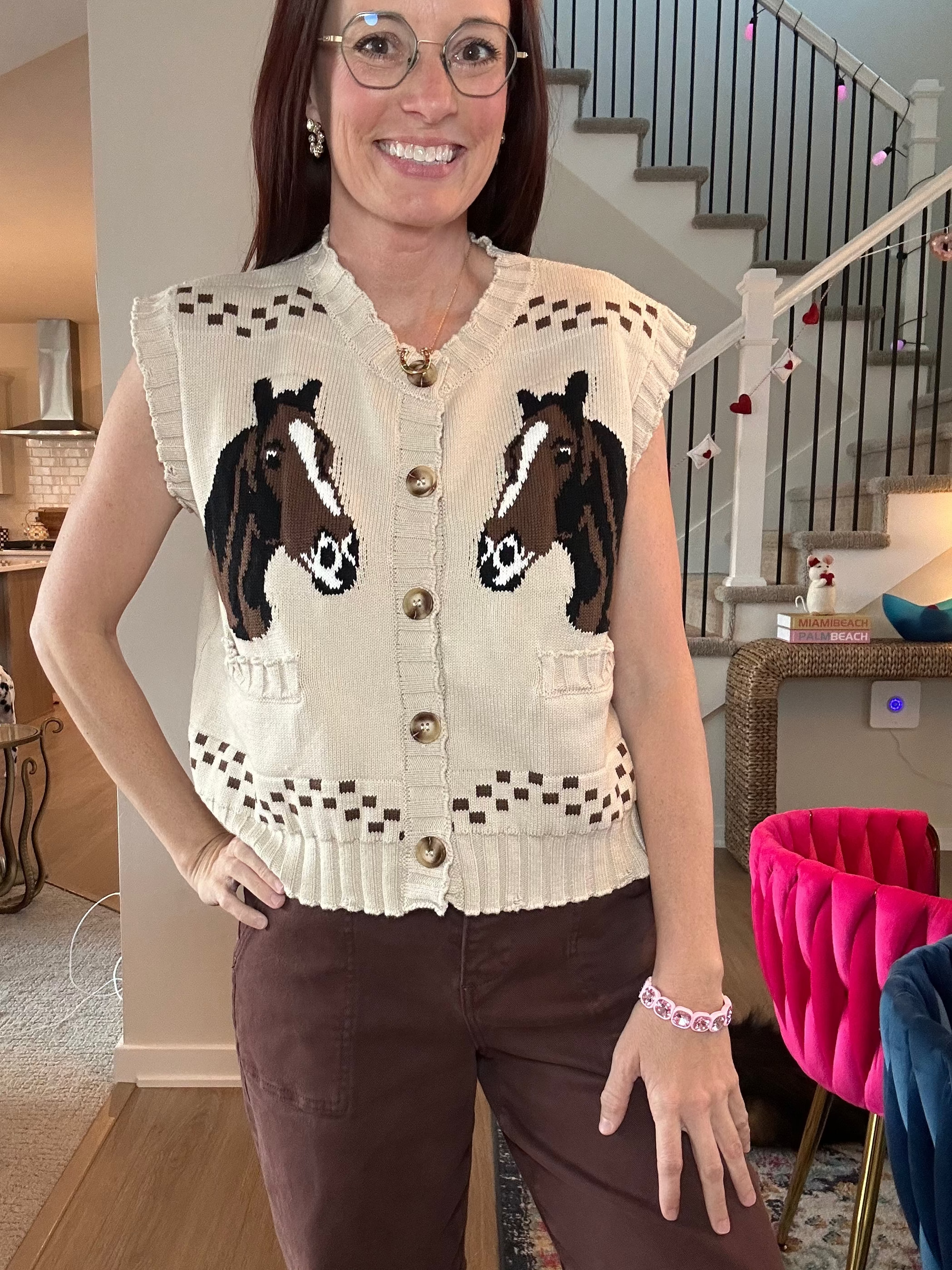 A little western, a little girly. This light brown cardigan vest features horse details throughout and a pop of pink with a horseshoe on the back. True to size, easy to layer, and made to match perfectly with our brown Risen barrel jeans