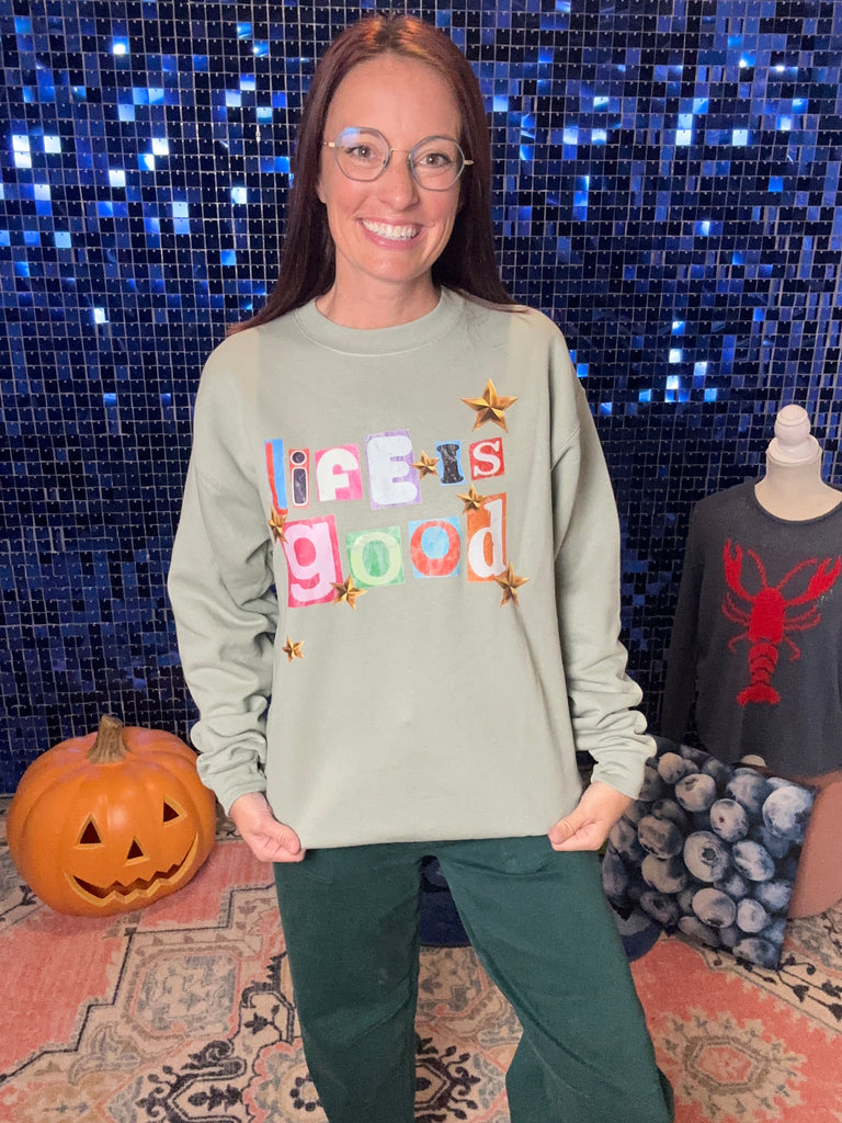 This Life is Good sweater offers a bright, bold, and colorful design that fits true to size. For those seeking extra room to grow, sizing up is recommended to ensure maximum comfort and longevity.