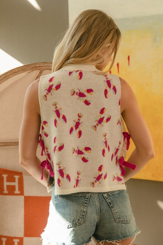 This charming lobster sweater vest combines playful design with expert craftsmanship. Featuring delicate pink bows on each side, it adds a whimsical touch to a cozy knit silhouette. Perfect for layering, this vest offers both comfort and a unique style statement for those who appreciate fun, distinctive fashion pieces.