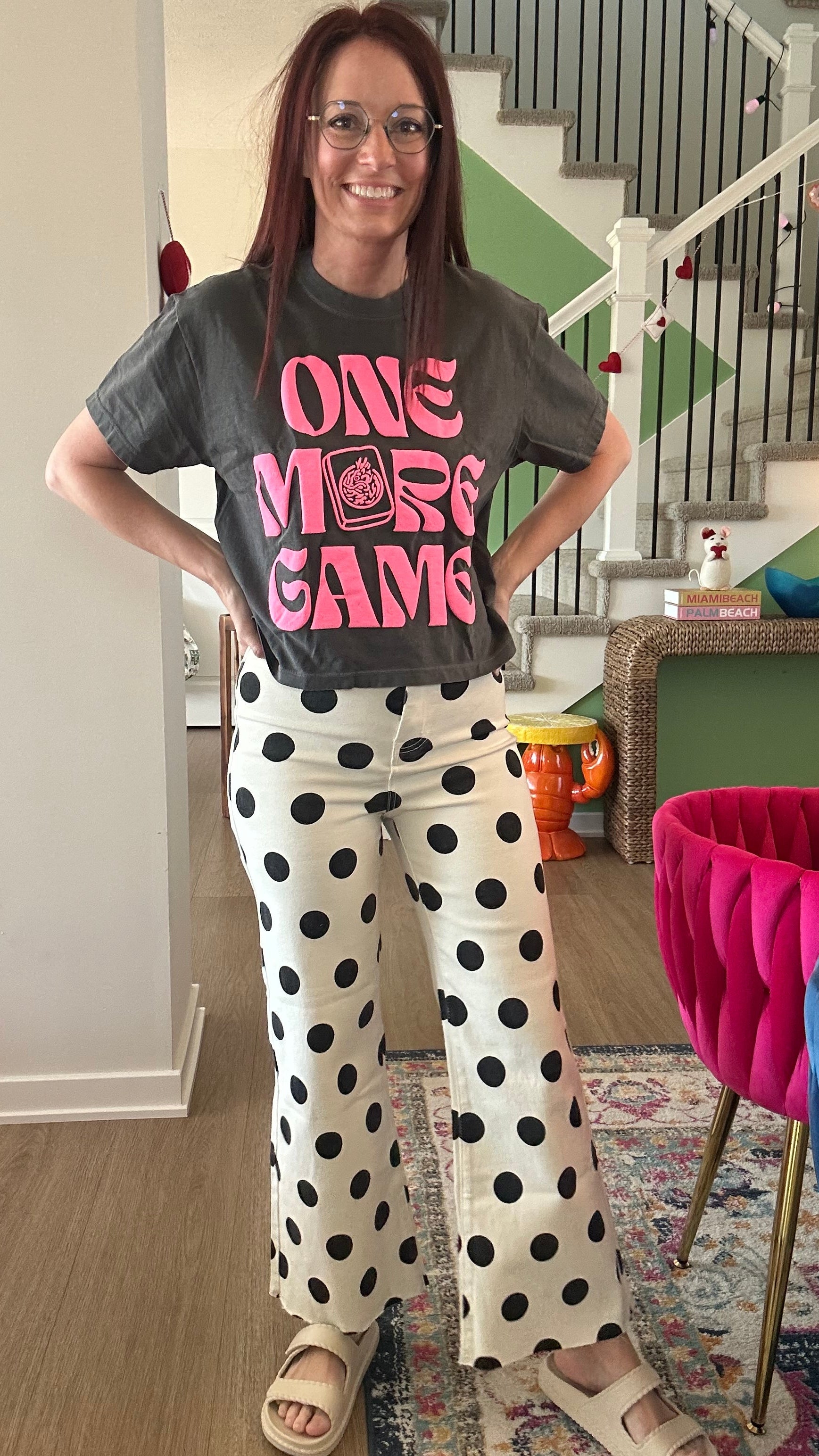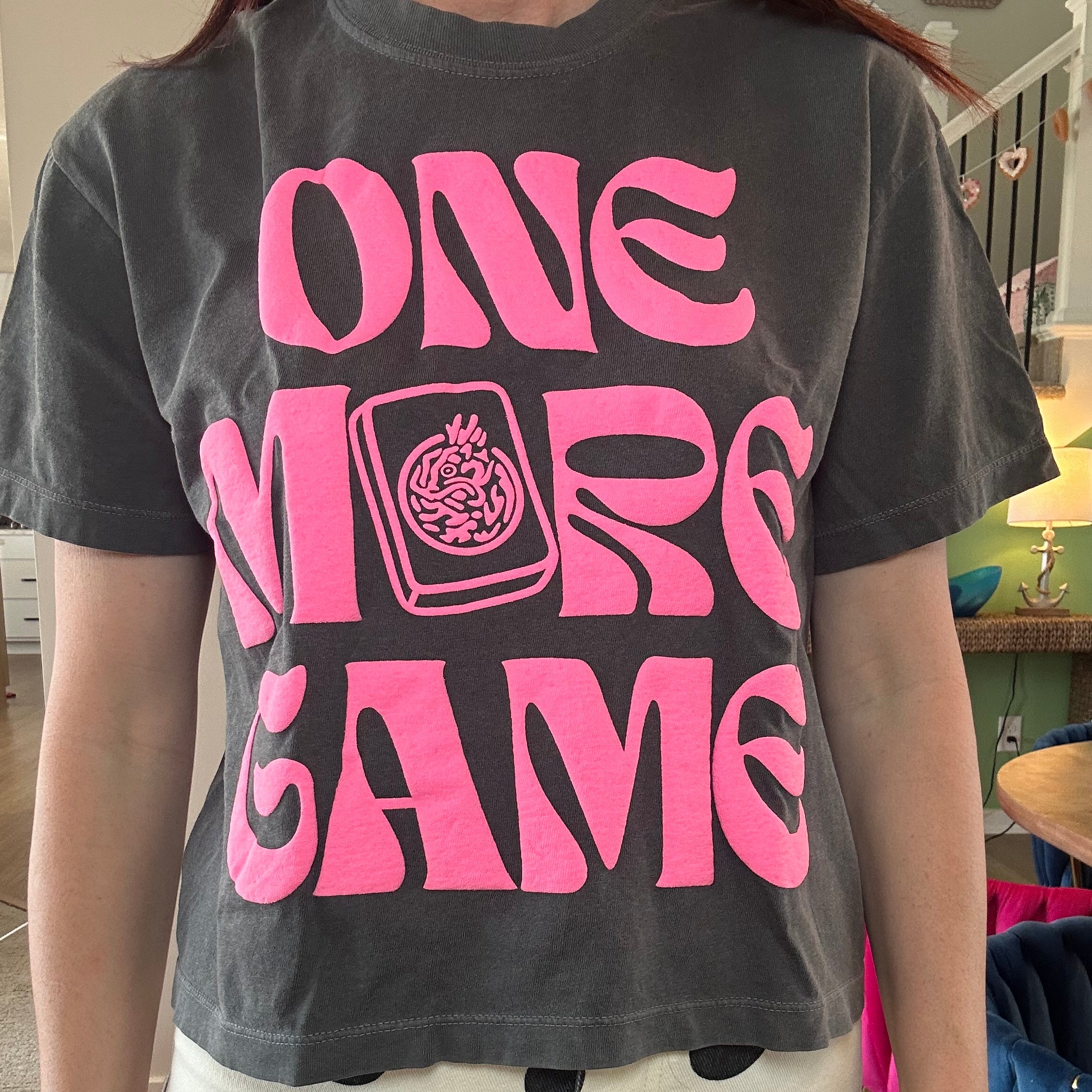 # One More Game T-Shirt Elevate your casual wardrobe with this expertly crafted tee featuring a striking design that merges gaming culture with contemporary style. The cropped silhouette offers a modern, flattering fit, while the hot pink puff detailing adds dimensional texture and visual interest. Emblazoned with "One More Game" typography alongside a mahjong tile graphic, this piece speaks to strategy enthusiasts and casual gamers alike. Constructed for comfort and durability, it's the perfect statement piece for those who appreciate clever design and playful sophistication.