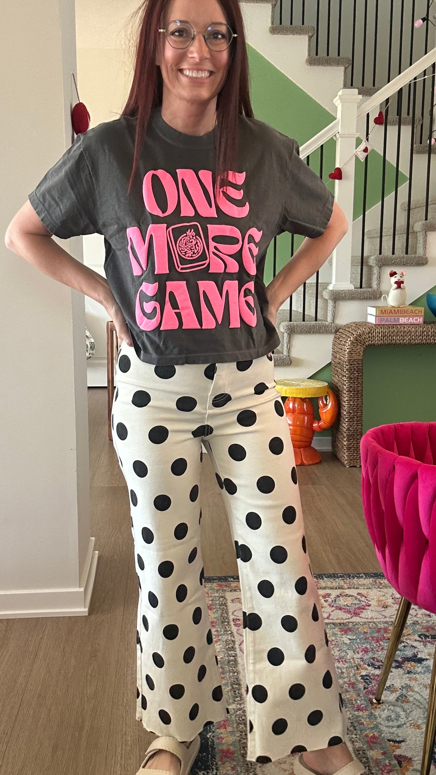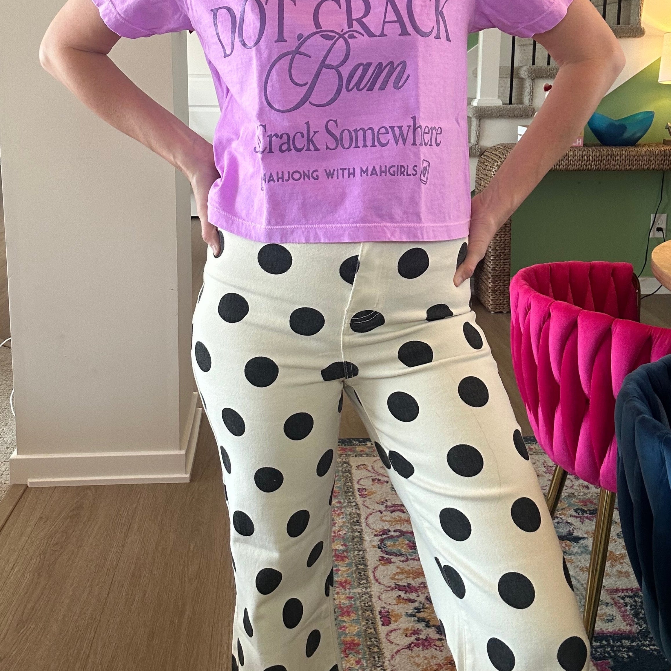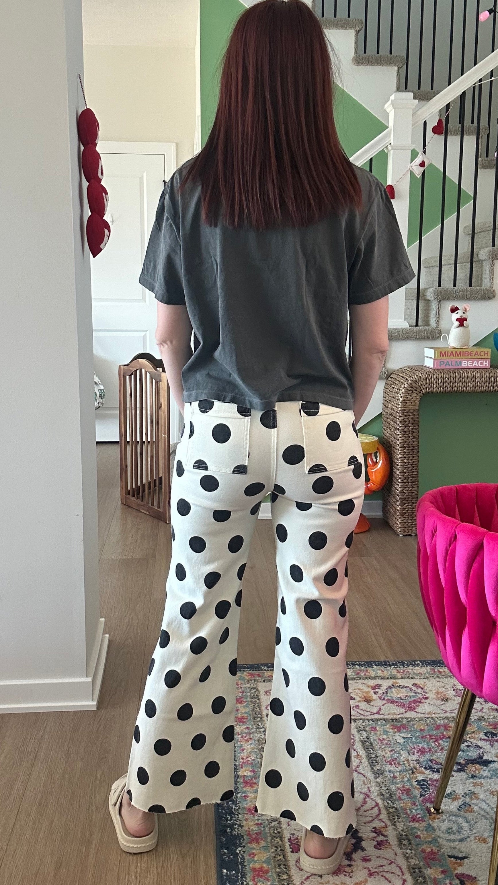 Cropped raw hem denim in cream with bold black polka dots offers a playful yet sophisticated edge to your wardrobe. The built-in stretch fabric ensures comfortable movement throughout the day, while the cropped silhouette keeps proportions modern and flattering. We recommend sizing up one size for an optimal fit that allows the stretch to work its magic without feeling restrictive. The raw hem adds an intentional, fashion-forward detail that pairs effortlessly with sneakers or heels.