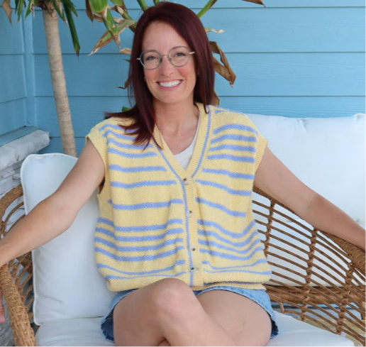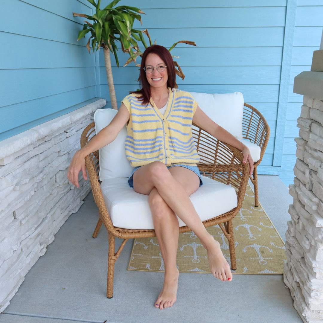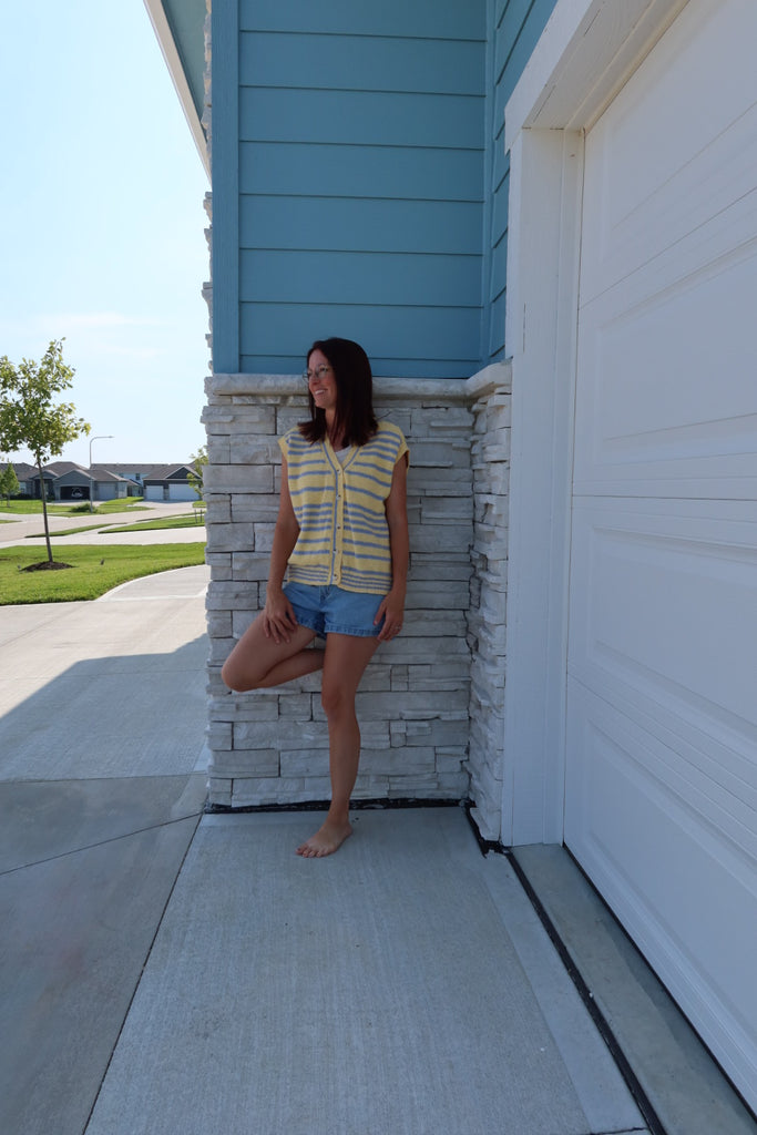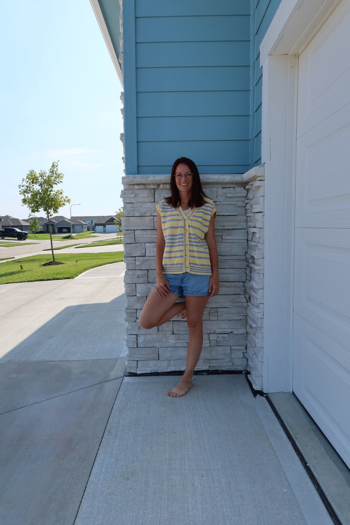 This short sleeve sweater expertly combines a yellow and blue color palette with an oversized fit. Designed with a button-up front, it offers both style and comfort.